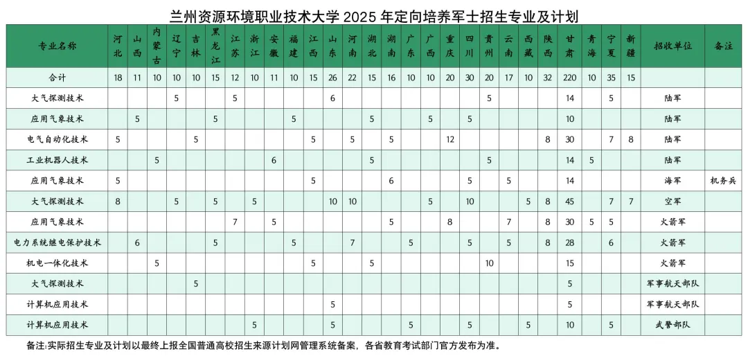 学校于2012年被确定为全国首批11所定向培养士官试点院校,目前是甘肃省唯一的定向培养军士招生院校,与陆军、海军、空军、火箭军、军事航天部队、武警部队联合培养军士生。目前定向培养军士生在校规模为2600人。